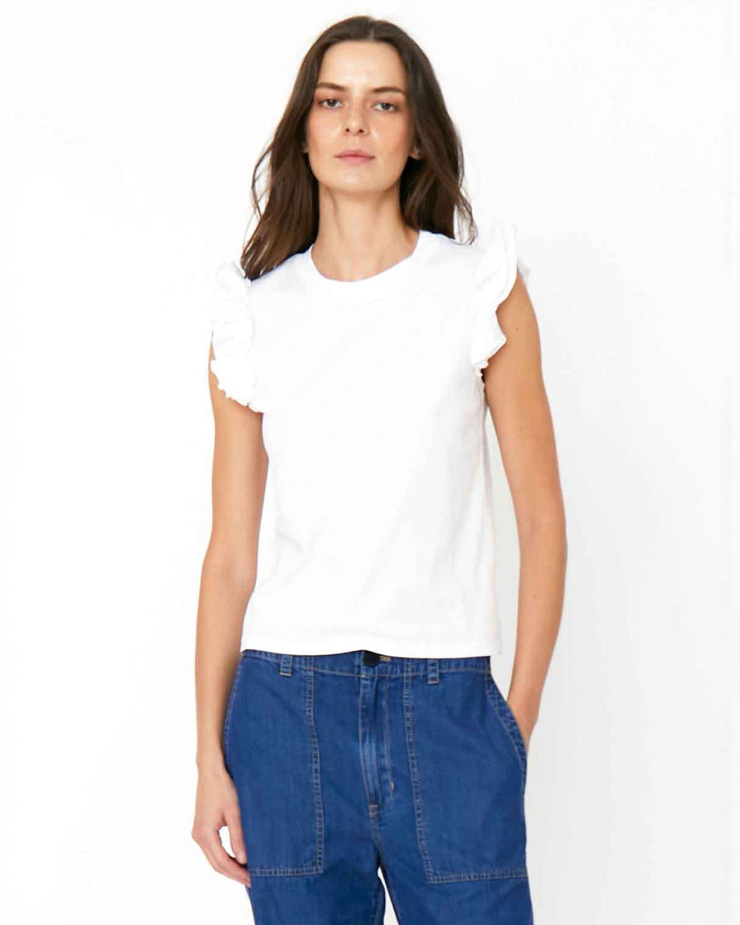 Let's have a Kiki ;) Like with potato chips, a ruffle is always better, so we added ruffles to the shoulders of this sleeveless tee. Instantly spices up your look!
