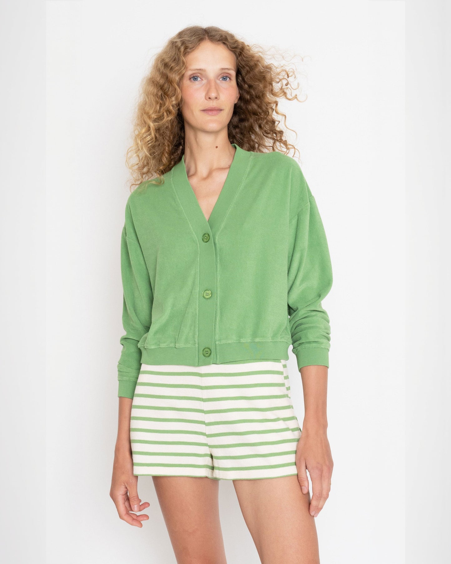 A slightly oversized, perfectly cropped, three-button terry cardigan? Yes, please! Add this to the list of things you didn’t know you needed but absolutely do. Plush yourself to the limit.